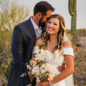 The bride wore a strapless illusion corset look bodice lace mermaid with light beaded and sequins. The wedding dress also features a long train with layers of tulle and lace appliques overlaid on it. This gorgeous champagne lace mermaid wedding dress is available in our Phoenix, Arizona and Los Angeles, California area bridal stores for under $2000. She carried a stunning wedding bouquet with romantic flowers hanging down and a mix of pastels.