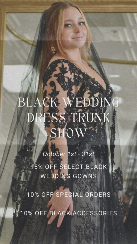 It’s spooky season and the best way to celebrate is now booking: our Black Wedding Dress Trunk Show! This unique event will take place during the entire month of October at both our Long Beach, California and Chandler, Arizona bridal stores. We will be offering 15% off select off the rack black wedding wedding gowns, 10% off special order black wedding dresses, and well as 10% off select black wedding dress accessories. This is a black wedding dress sale you won’t want to miss, especially if you are a 2025 bride!
