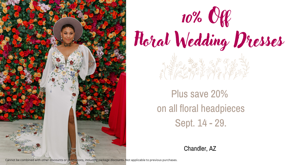 Don’t miss the chance to transform your bridal vision into reality at our floral wedding dress trunk show. Whether you’re drawn to elegant floral patterns or bold, vibrant hues, our selection is designed to celebrate every unique style. Take advantage of exclusive discounts, including 10% off custom ordered floral wedding dresses and off the rack floral wedding gowns, 20% off select headpieces, and 10% off select veils. This floral wedding dress trunk show is the perfect opportunity to find your dream wedding gown and accessorize with standout pieces at exceptional prices. We can’t wait to help you find the perfect look for your special day!