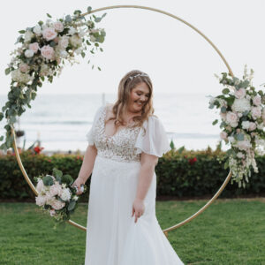 Brooklyn came to our Chandler bridal shop with a few wedding dress shops already behind her, but she hadn’t yet found the one. That changed when she met her bridal stylist, Ronnie! “Ronnie listened to me and brought me what I wanted, but also some things I didn’t know I wanted to try on,” Brooklyn shared. Her wedding gown was a romantic, off-the-shoulder A-line with dreamy tulle and floral lace appliqué, which was perfect for her desert wedding. She looked absolutely stunning and told us that what made her experience different was how Ronnie “wasn’t pushy at all but so personable.” Brooklyn felt seen, heard, and supported every step of the way, and that’s what we strive for with every bride.