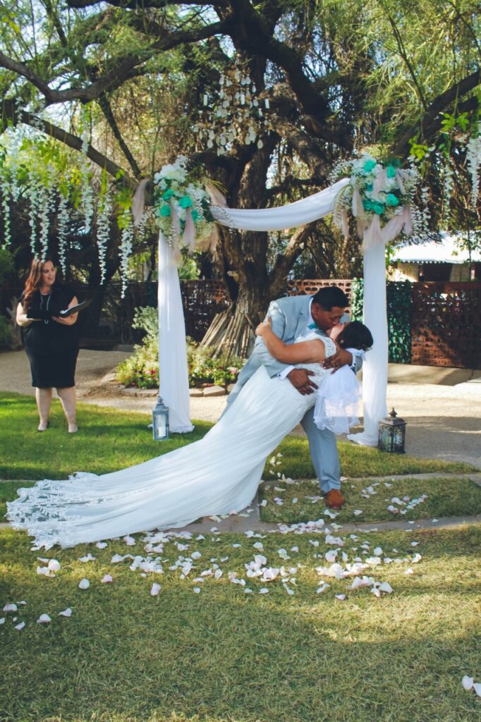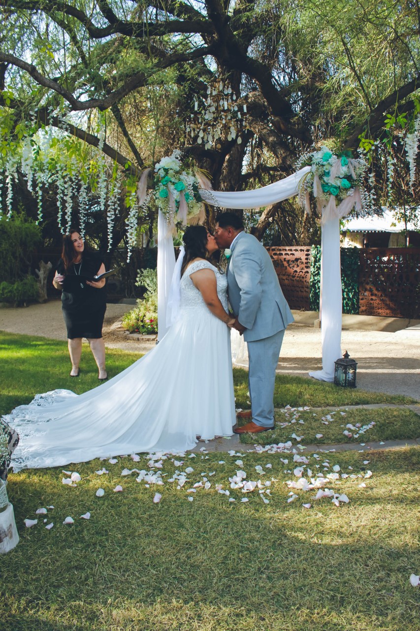 The Whispering Tree Ranch is one of our favorite Arizona wedding venues for so many reasons! It is a “hidden gem“ as we like to call if, in the middle of the desert. The Whispering Tree Ranch is a serene experience, a favored place of many different native birds, the ceremony area offers a lush green grass field, and also provides an intimate setting for you and your guests.