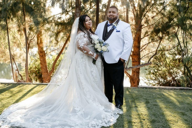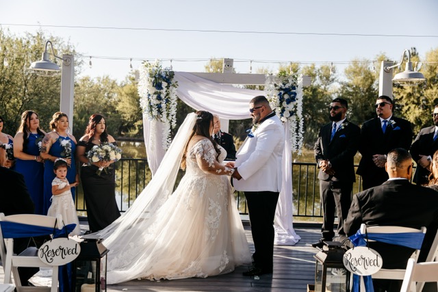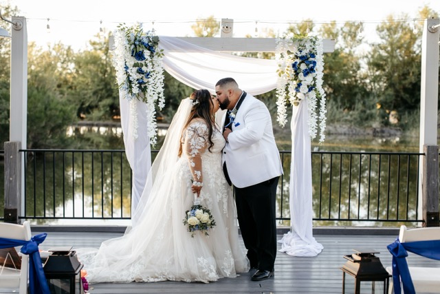 On May 6th, 2022, Elisha and her fiancé Gabriel were wed. The wedding was held at the Windmill Winery in Florence, Arizona. “This venue was so beautiful.” She told us, “Every aspect of the Lakehouse Venue was absolutely stunning. The ceremony was outdoors on the lake, while the reception was inside.” Adding touches of blue and white to the archway, Elisha and Gabriel made their day, especially for them.