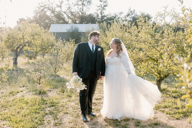 We’re so excited to feature one of our beautiful brides, Katie L., who tied the knot September 15th, 2024, in a dreamy, outdoor setting in the forest of Idyllwild, California. Katie came to our Long Beach bridal shop looking for something that would perfectly match her vision of a soft, romantic wedding. With her mom by her side, she met with our stylist, Nick, to bring her dream bridal look to life with a soft, romantic aline wedding dress with sleeves.