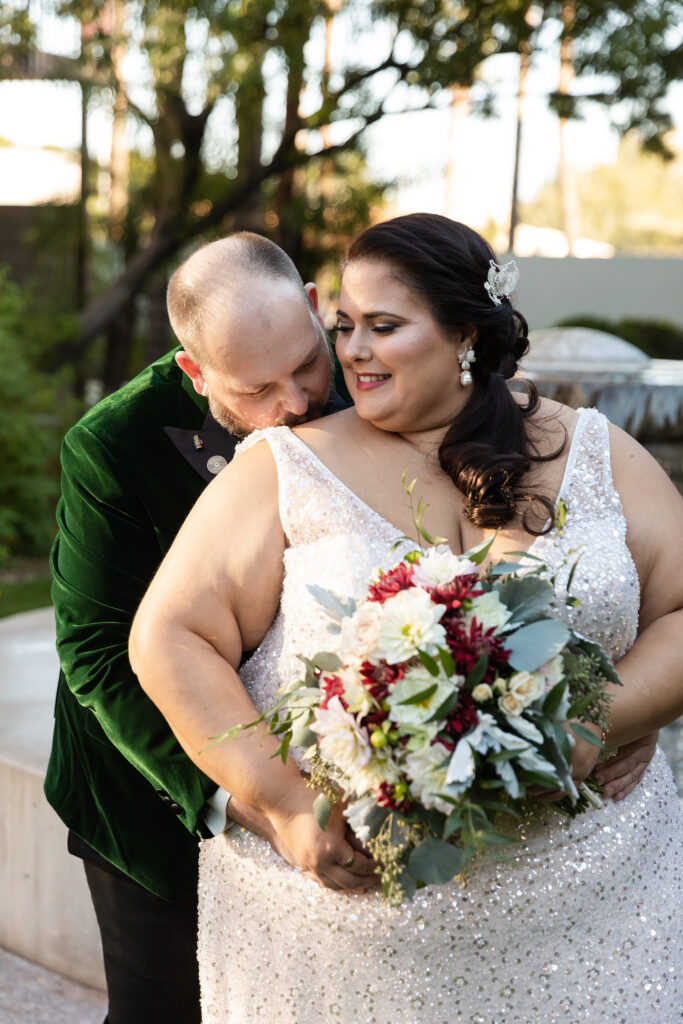 The groom’s tux features a custom green velvet jacket from Celeb Tux ‘n Tails and the wedding cake by Paula Jacqueline complimented the aesthetic to a T, with flowers to match the white and burgundy bouquet and boutonnières.