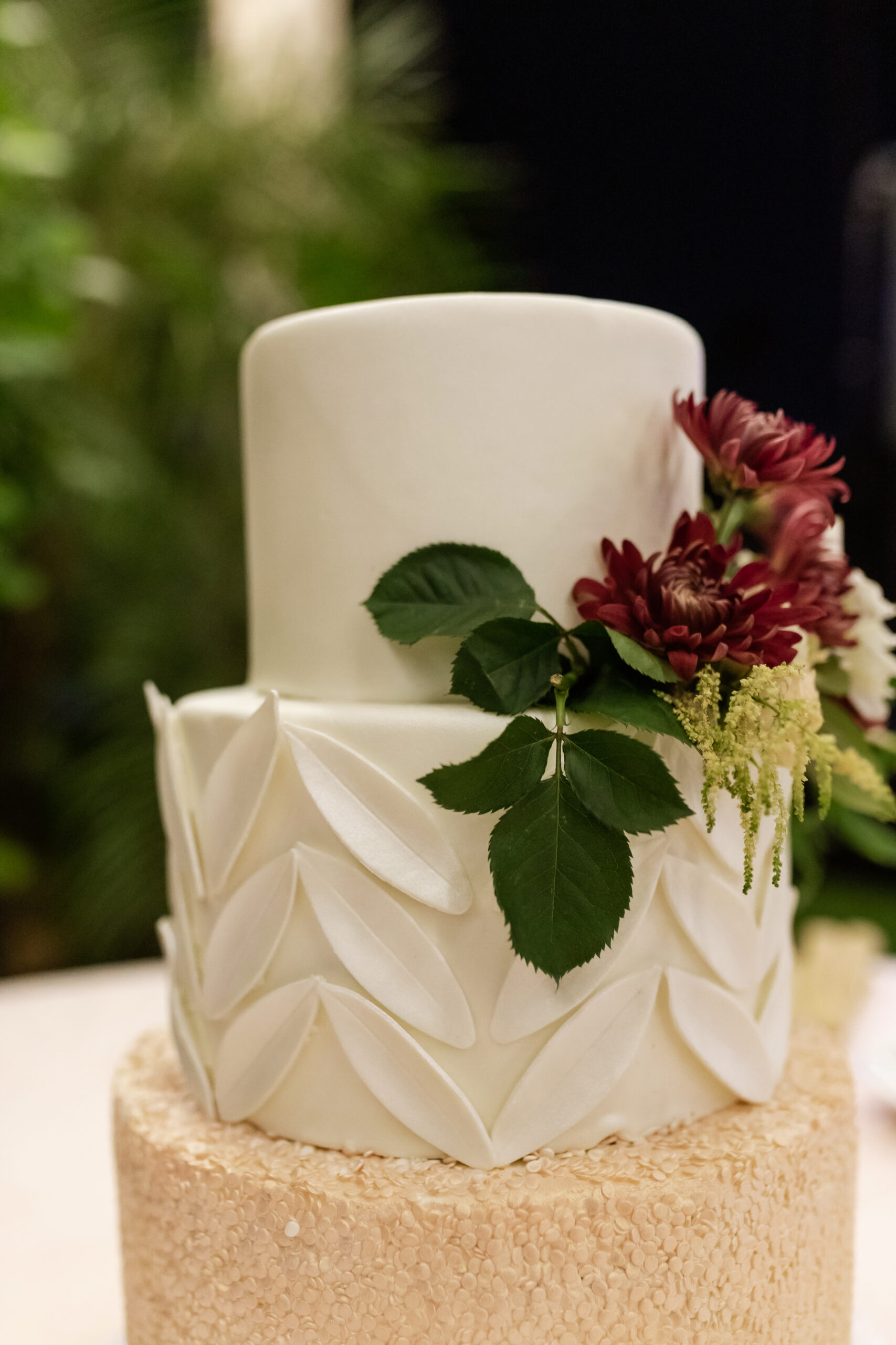 The groom’s tux features a custom green velvet jacket from Celeb Tux ‘n Tails and the wedding cake by Paula Jacqueline complimented the aesthetic to a T, with flowers to match the white and burgundy bouquet and boutonnières.