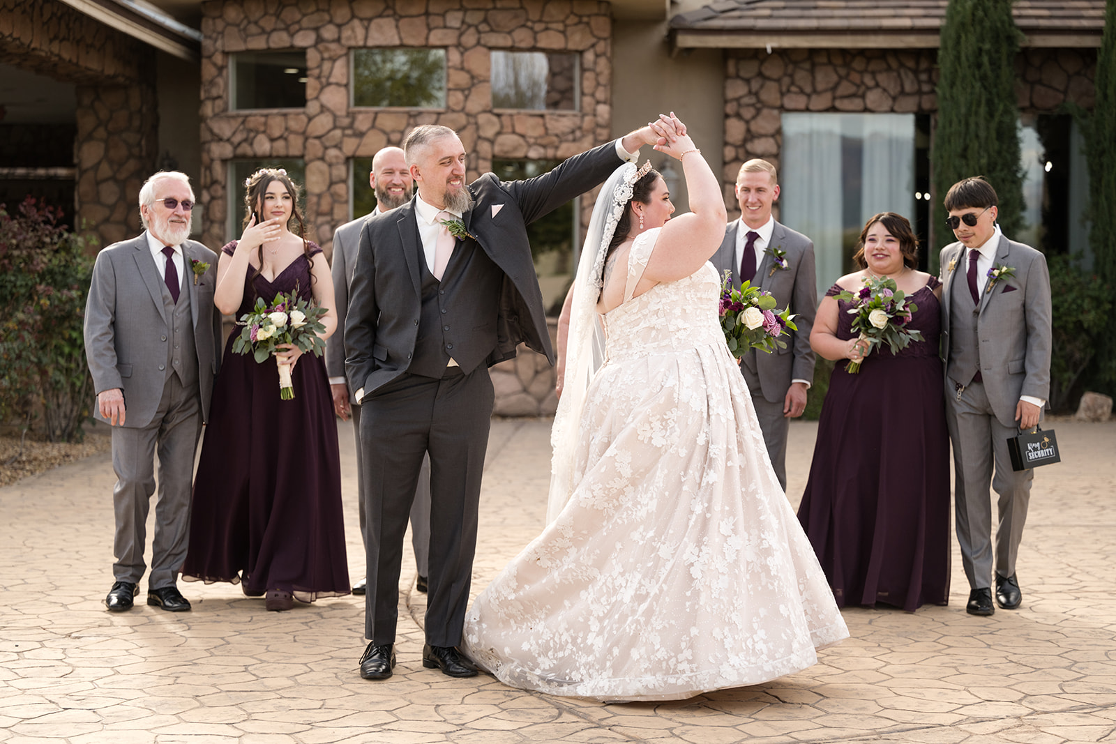Sidney was glowing while standing next to her bridesmaids and groomsmen, who wore deep plum gowns and stone grey suits that made her ivory lace and champagne lining wedding dress pop even more. The outfits and the desert venue’s rustic stone walls created a warm, earthy palette that tied the whole look together. Every detail, from the fresh floral bouquets to the mountain views, reflected Sidney and James’s unique love story and created an unforgettable atmosphere.