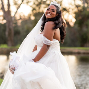 “I came into Strut after going to several places. Everyone I know is on the east coast so I came in by myself, sad and discouraged and not really expecting anything but I didn’t want to cancel the appointment because I knew I had to find something. Julie sat down with me and asked me a few questions. She went on to pull some dresses for me and my mood completely shifted with the very first one I tried. I felt Julie understood what I was looking for and her personality made me feel like I did indeed have a friend there with me. I appreciated her not being pushy and just letting me talk thru what I liked/disliked. When I tried on my dress the first time, I actually liked it but felt it was a bit too dramatic for me and wayyy too revealing for a church wedding. Julie helped me find an adorable covering which I wound up purchasing that day. However, I did not buy the dress that day. I went home and looked at photos, shared with friends, and actually went on to more appointments at other places. One thing kept happening though, I kept comparing every dress to the one I tried at Strut. I finally returned a week or so later and made the purchase. This was my dress! After alterations, the dress was less revealing and I wound up not wearing the covering for church because the weather was unusually warm for October.”